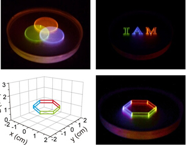 黄维院士介绍说,受限于发光材料固定波段、单一颜色发光的特点,二维彩色显示系统通常需要通过调控红、绿、蓝三种发光材料的颜色通道以及它们相互之间的叠加来得到彩色显示效果,即在显示器中,每个像素点都需要用薄膜晶体管独立控制,且每个像素点都包含红、绿、蓝三基色单元,这对工艺难度及器件稳定性都有很高的要求,也限制了显示器分辨率的进一步提高。此次开发的“全色”发光的透明纳米材料,将镧系金属离子精确掺入纳米粒子的核壳结构中,巧妙利用稀土离子间的能量传递、敏化和能量上转换技术,实现了透明无机纳米材料的“全色”发光。该纳米粒子能在不同红外激光脉冲的激发下,发出各种颜色连续可调的可见光,不需要独立的红、绿、蓝三基色,每个纳米颗粒即是一个像素点,将分辨率提高到纳米级。更为重要的是,将这些在可见光条件下透明的纳米颗粒均匀分散在三维空间中,通过肉眼不可见激光的激发和调制,可以发出多种不同颜色的可见光,从而实现真正意义上的真实立体彩色显示,并在空间三个维度都达到纳米级的极限显示分辨率,这是传统显示方法所不能企及的,为立体显示技术提供了一条革命性的思路和途径。福利姬