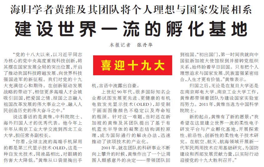 新的起点,黄维有了新的愿景:“我希望在这里建立世界一流的柔性电子研发平台与产业孵化基地,开展探索性、前沿性、创新性的柔性电子技术研究。在航空、航天、航海领域开展新一代军民两用技术应用基础研究,为国防建设和西部发展贡献力量,以实际行动迎接党的十九大胜利召开。”