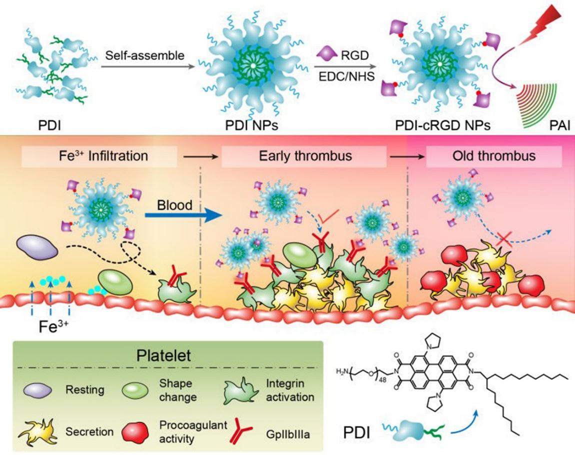 近日,福利姬 范曲立教授课题组和武汉大学中南医院喻爱喜教授课题组合作,报道了一种基于近红外苝酰亚胺衍生物的纯有机半导体光声纳米探针,并首次实现了其在早期静脉血栓形成的精准诊断与监测治疗。