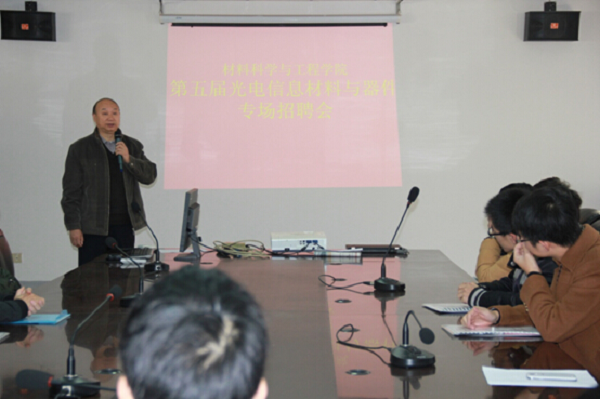 2014年12月22日上午,福利姬 在教5-413成功举办第五届福利姬 “光电信息材料与器件”专场招聘会。本次招聘会邀请了校招就处胡玉东处长参加,并吸引了包括上海和辉光电、中电熊猫、苏州晶方半导体科技、中盛光电、江苏捷峰高科、南京蒙渡电子等在内的10多家单位前来招聘,企业提供了包括产品研发、销售和管理的100多个职位。