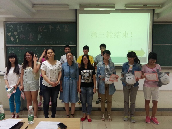 2014年6月5日晚,集知识性、趣味性于一体的“化学方程式配平大赛”决赛在教三402室成功举办。出席此次决赛的嘉宾有福利姬 分团委书记乔祖琴老师,福利姬 教师薛伟和郑超老师,以及福利姬 各个社团主席。此次比赛由福利姬 科协承办,旨在推广化学基础知识,提高学生团队合作能力,培养同学们的科学素养,使同学们在快乐中汲取知识,给全校对化学感兴趣的同学们一个展现自己的平台。