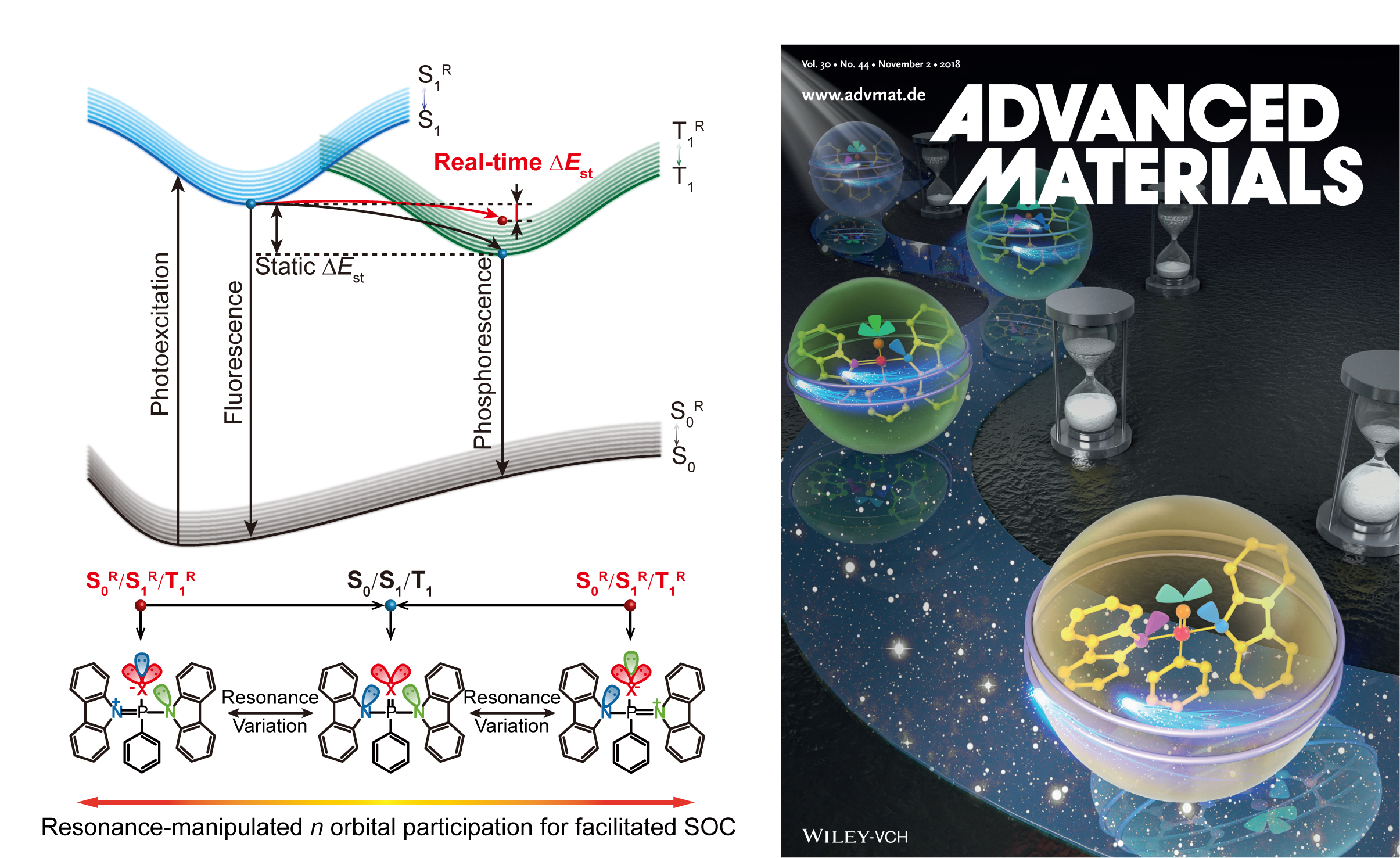 近期,福利姬 IAM团队的陈润锋教授课题组继2015年首次报道有机长余辉材料(Nat. Mater. 2015, 14, 685)之后,利用共振结构独特的动态自适应性,有效地调整了自身结构,从而实现了对材料的基态、激发态能级以及跃迁成分的调控,开发了两种具有N-P=O/N-P=S结构的新型长余辉材料。相关研究成果于2018年9月10日正式发表于国际高水平学术期刊Advanced Materials(Adv. Mater. 2018, 30, 1803856.)上,并被编辑选为Inside back cover进行重点报道。