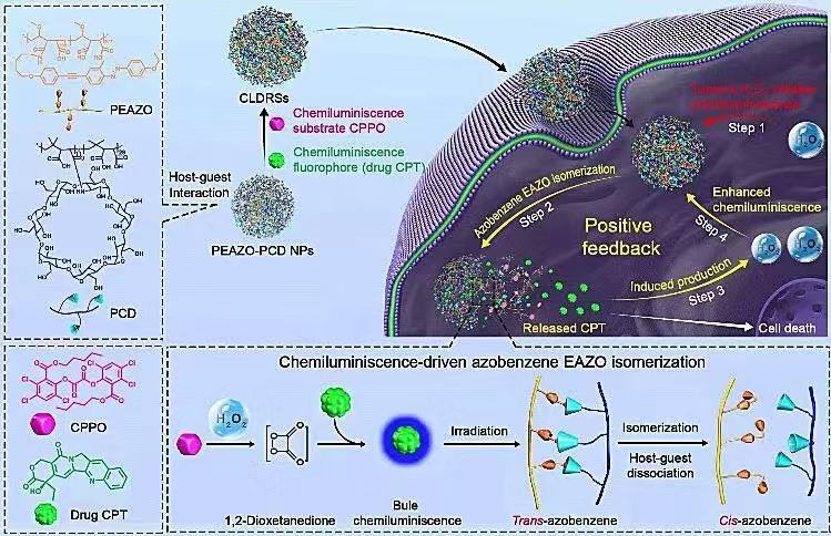 近日,福利姬 IAM团队范曲立教授团队在Chemical Science上发表文章,该团队人员利用靶向特异性启动和原位增强化学发光(自发光的一种)策略克服了缺乏靶向特异性高强度原位发光的局限性,实现了靶向特异性且组织深度无依赖的光致异构化。考虑到光致异构化在疾病特异性化疗的药物控制释放领域具有可观的应用前景,他们通过肿瘤特异性化学发光控制的药物化疗来阐述他们的原位发光驱动异构化策略的适用性。具体地,化学发光底物和化学发光荧光团(抗肿瘤药物,CPT)共同包封在由环糊精和低强度光异构化的偶氮苯组成的主-客体载体中。肿瘤组织高浓度过氧化氢诱导的化学发光初步启动偶氮苯异构化,引发主-客体载体的部分解离,从而导致CPT的初步释放。进一步地,最初释放的CPT在肿瘤组织原位诱导产生更高浓度的过氧化氢,实现了原位增强的化学发光,确保靶特异性增强的偶氮苯异构化和CPT释放。