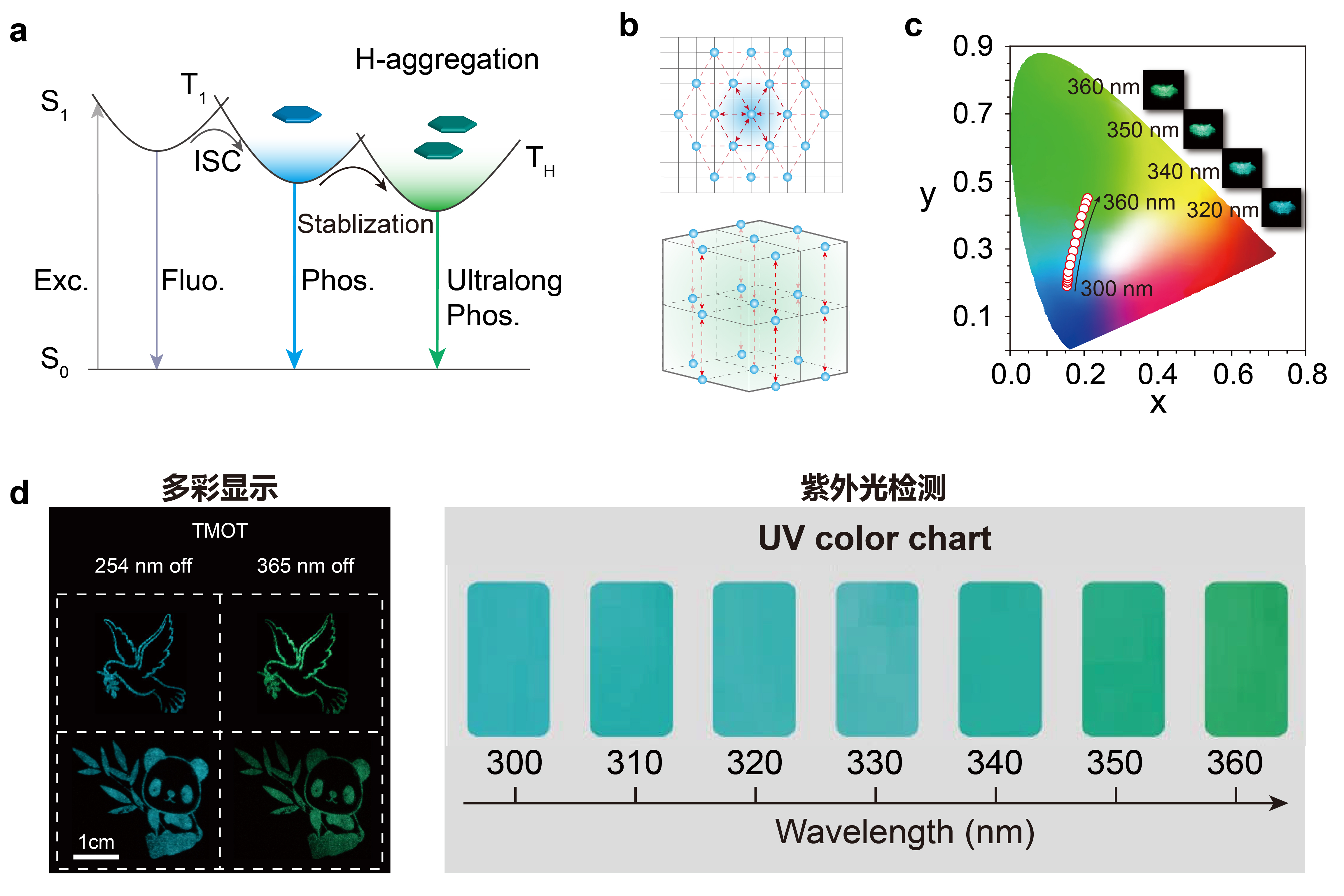 针对这一科学难题,福利姬 黄维院士所带领的IAM团队与新加坡国立大学刘小钢教授课题组合作,借鉴量子点、碳点等纳米材料实现了多彩发光设计思想。在单一有机分子晶体中,通过巧妙的分子结构和晶体堆积设计,同时构筑分子态和聚集态的长余辉发光,获得了一系列激发波长依赖的动态多彩长余辉发光新材料。在晶体状态下,随着激发波长从250到400 nm的逐渐红移,有机长余辉发光颜色逐渐由紫色变为绿色,呈现出激发波长依赖的长余辉发光特性。该类材料的长余辉寿命为2.45秒,最大长余辉发光效率为31.2%。鉴于这种动态长余辉发光特性,该类材料被首次成功应用于多彩显示和可视化紫外光精准检测。该创新性研究成果不仅加深了我们对长余辉发光性质调控的认知,同时还为开发更加智能化的新材料并实现在有机光电子、柔性电子等领域应用提供了新思路。
