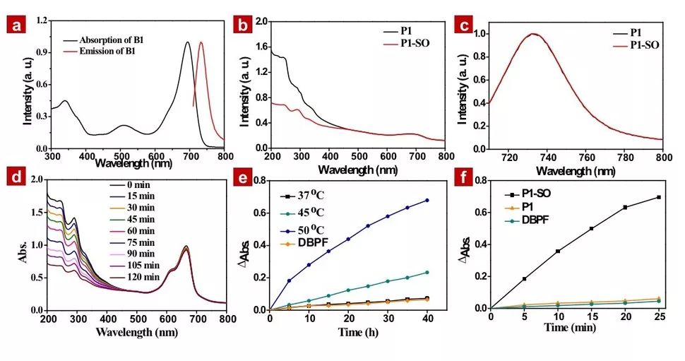 图2 (a)-(c)B1和聚合物载体的紫外-可见吸收光谱和荧光发射光谱;(d)P1的单线态氧捕获性能;在乏氧环境中,不同温度(e)和光照后(f)P1-SO的单线态氧释放性能。