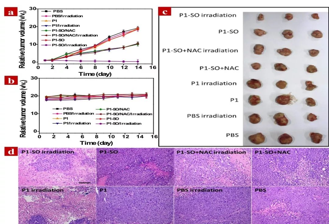 最后,作者将P1-SO应用于小鼠活体肿瘤治疗中,证明了富集在肿瘤部位的P1-SO在光照后能快速大量的释放出单线态氧,并进一步实现了活体乏氧肿瘤的光动力治疗(图4)。