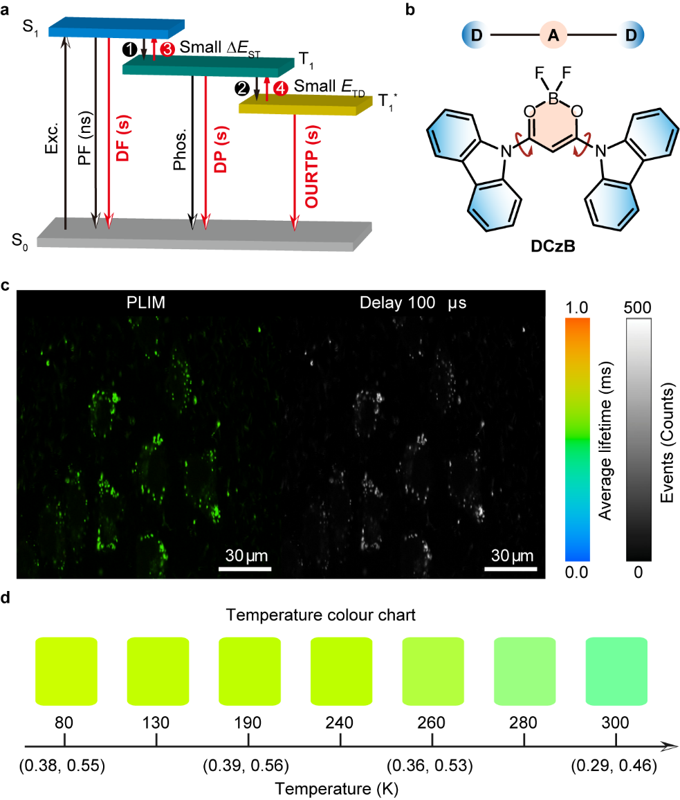 所开发的余辉材料寿命为0.23 s,余辉效率高达45%,这是迄今为止报道的最高余辉效率。更重要的是,本研究利用新开发的有机长余辉材料,拓展了其在磷光寿命成像以及可视化温度检测方面的应用。因此,开发的热活化三模式余辉发光材料是实现余辉效率增强的有效方式,代表了高效有机长余辉领域的重要进展。