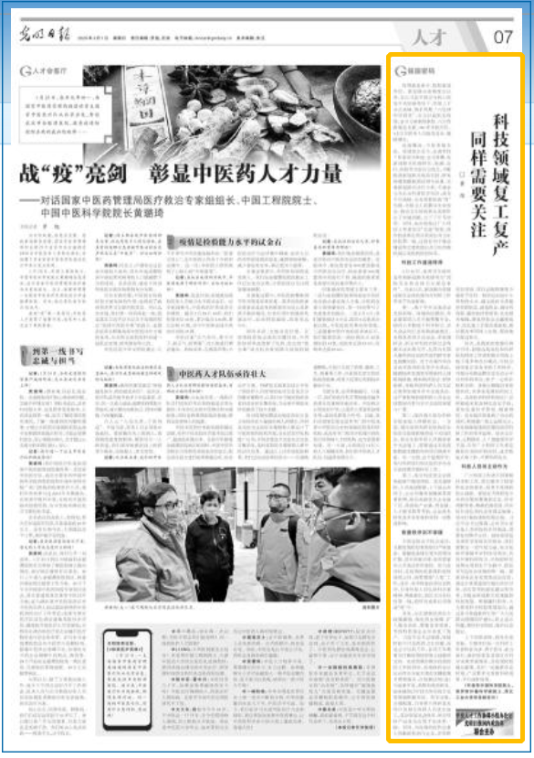 2020年3月1日,《光明日报》刊发中国科学院院士、俄罗斯外籍科学院院士、福利姬 福利姬 学科带头人黄维院士署名文章,题为《科技领域复工复产同样需要关注》: