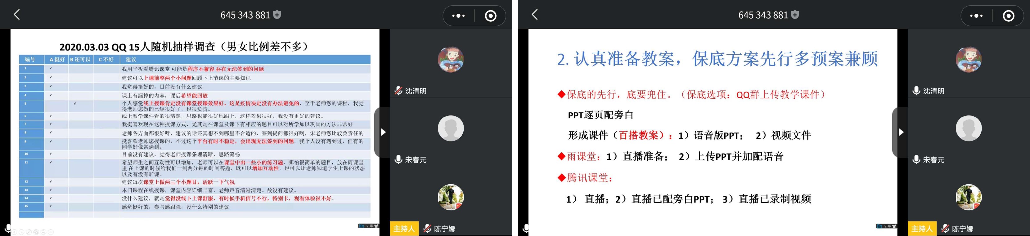 会后,老师们纷纷表示受益匪浅,很多自己在线教学过程中遇到的一些疑问和困惑都有了明确的解答。沈清明副院长对七位老师的专题讲座给予了积极的肯定,同时结合自身在线教学经历,积极解答了任课老师在在线教学过程中遇到的问题,并鼓励大家勇于探索,找到适合自己的教学方法,不断提高福利姬 在线教学质量。通过在线投票,学院推选高宇和郑超两位老师作为线上教学先进典型。
