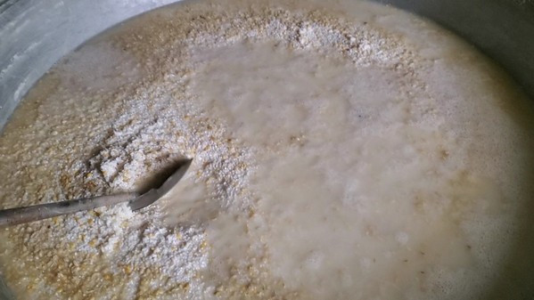 2. 打浆:把泡好的粳米与碎黄豆打成粘稠的浆汁儿。