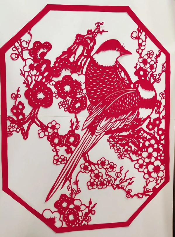 剪纸作品,一纸一刀,喜上“梅”梢。一刻一转,鹿现深林。一裁一展,佳人侧目。清晰的轮廓,生动的细节,无一不把满园春色跃然纸上。线条描摹里,蕴含了青年人的审美观念,昭示了年轻人的蓬勃朝气。