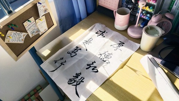 书法作品,纤纤毫毛,饱蘸墨汁,弹指一挥间,纸上已两行。“厚德弘毅,求是笃行”提笔落笔间,墨香氤氲,笔力遒劲。字里行间流露出南邮的精神,隐藏着流淌千年的文化脉络。一笔挥就,动人心弦。