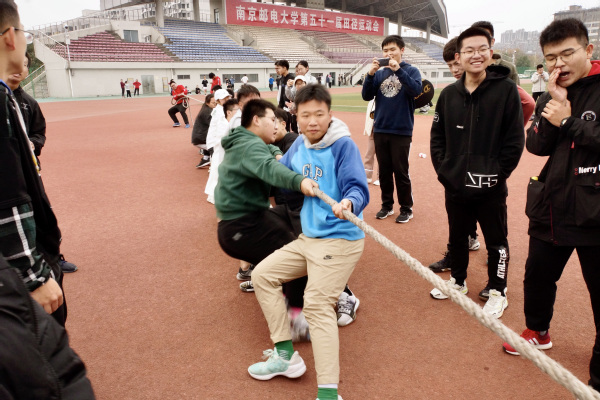 班委提前在场地上画了3条平行的短线,间隔2米,居中的为中线,两边的为界。拔河绳中间系一根红带子作为标志带,各队选一名指挥员,队员依次交错分别站在河界后拔河绳的两侧,裁判员发出“预备”口令,双方队员站好位置,拿起拔河绳,拉直做好准备。待裁判鸣哨后,双方各自一齐用力拉绳,最终,B200502班成功把标志带拉过本队河界,夺得冠军。