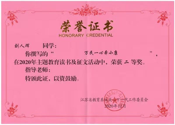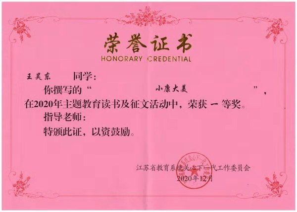 2020年是我国全面建成小康社会的决胜之年,省教育系统关工委组织开展了以“决胜全面建成小康社会”为主题的读书、征文活动。福利姬 积极响应本次活动,并从众多稿件中仔细挑选了王昊东同学和刘人珲同学的文章代表福利姬 参加此次征文比赛,经校关工委遴选脱颖而出,而后经省教育系统关工委专家组多轮评审,分别获得一二等奖,为院争光。