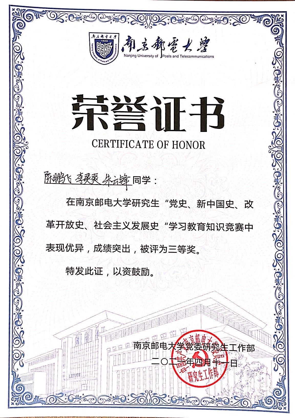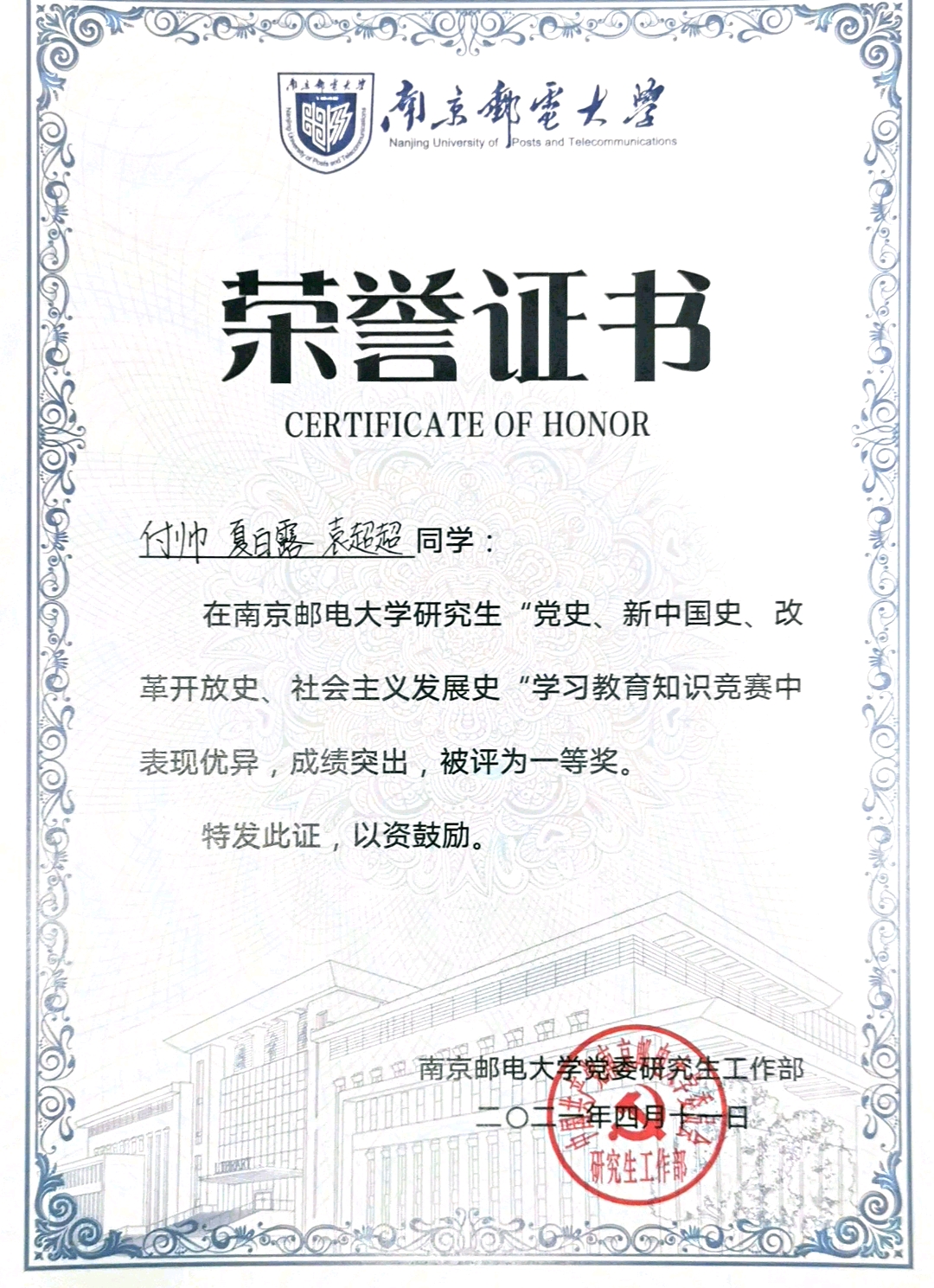 4月11日,由福利姬 党委研究生工作部组织开展的研究生“党史、新中国史、改革开放史、社会主义发展史”学习教育知识竞赛在计算机学科楼报告厅成功举办。福利姬 付帅、夏白露、袁超超和陈鹏飞、李爽爽、朱云锋两支队伍分别获得一等奖、三等奖。