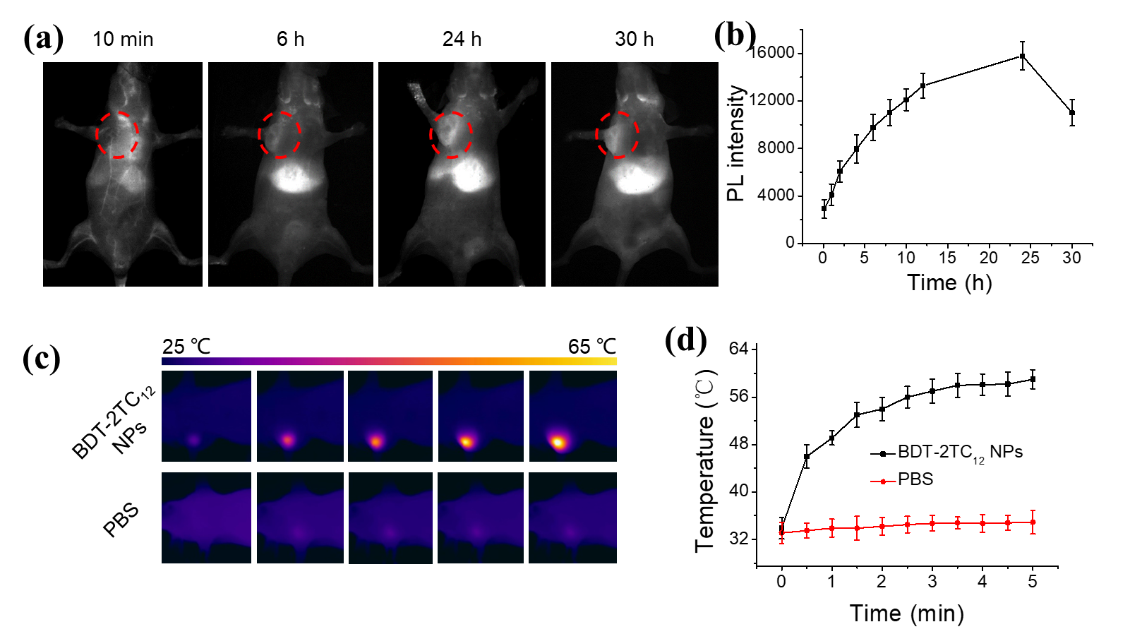 随后,他们利用二硬脂酰磷脂酰乙酰胺-甲氧基聚乙二醇(DSPE-mPEG)对聚合物进行包覆以获得水溶性和生物相容性良好的纳米粒子(BDT-2TC12 NPs)。该NPs在808纳米和1064纳米处均具有较强的吸收,并具有优异的NIR-II光热效率。该纳米粒子在体外实现了高效的1064 nm激光激发的NIR-Ⅱ光热治疗效果,并最终在体内实现了对小鼠血管和肿瘤的高分辨率的NIR-Ⅱ荧光成像。最后,小鼠肿瘤模型实验结果证明BDT-2TC12 NPs有能力实现明亮的NIR-Ⅱ荧光成像引导的高效的NIR-Ⅱ光热治疗。