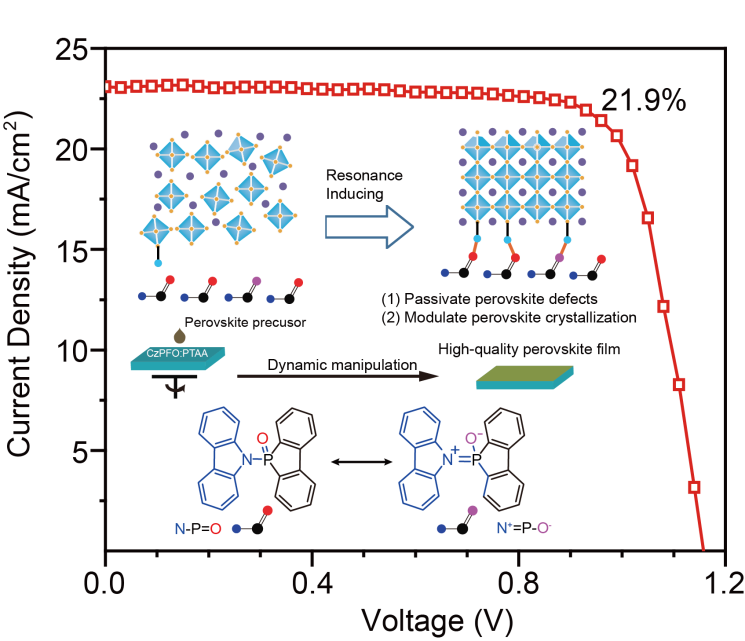 最近,福利姬 陈润锋教授、郑州大学段征教授以及阿卜杜拉国王科技大学殷骏博士报道了一种动态调控钙钛矿结晶生长的新策略,具体是设计制备具有动态共振结构的新型空穴传输材料,从钙钛矿底部进行结晶生长调控,该材料能够在中性和带电共振形式的多个电子态之间实现快速自适应的互变异构,诱导钙钛矿晶体生长并进行原位缺陷钝化,并通过共振变化与钙钛矿底部的Pb缺陷作用,形成具有光滑表面、定向结晶和低缺陷态的高质量钙钛矿薄膜,最终实现反式钙钛矿光伏电池的光电转换效率接近于22%(0.09 cm2),1.02 cm2大面积光伏器件也高达19.5%。此外,未封装器件在相对湿度为40~50%的空气中或在连续1个太阳光光照或在75oC退火条件下经过1000小时的老化分别保持初始效率的90%、88%或83%以上。这些结果说明通过共振分子可以成功实现动态调节钙钛矿结晶并促进底部缺陷原位修复,为高性能和大面积反式钙钛矿光伏器件研究提供了新的道路。