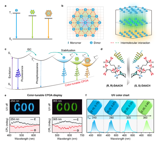 圆偏振有机长余辉发光(circularly polarized organic afterglow,CPOA)兼具超长寿命的室温磷光和高效的圆偏振发光特征,是一种独特的发光现象,因其在多级信息加密与防伪,三维立体显示,生物标记物识别以及高分辨率光学标记等领域的潜在应用受到了广泛的研究和关注。然而,由于手性单元与磷光发色团之间复杂的手性转移问题,目前报道的多数圆偏振有机长余辉材料的发光颜色局限于固定的发射颜色,如黄色或黄绿色发光。如何实现颜色可调的单组分圆偏振有机长余辉发光仍然是一个巨大的挑战。针对这一问题,黄维院士和陈润锋教授带领的团队提出了手性簇晶体的分子设计策略,通过将手性单元植入磷光簇聚集体中,由于手性簇晶体中大量的面内和层间分子间相互作用不仅可以很好地抑制三线态激子的非辐射跃迁,还可以形成强的空间共轭有效地构建尺寸依赖的簇触发圆偏振有机长余辉发光中心,因此手性簇晶体可以在不同光激发下实现单组分颜色可调的圆偏振有机长余辉发光,其发光颜色可以在470到530 nm大范围调整,寿命高达587 ms,不对称因子约为2.3 × 10-3。这一研究结果不仅提供了一个简单有效的平台来构筑具有激发波长依赖的颜色可调圆偏振有机长余辉发光,而且拓展了此类材料在多色CPL显示、加密和可视化紫外光检测等领域的应用,对于颜色可调的多彩圆偏振有机长余辉发光材料的开发具有重要的指导意义