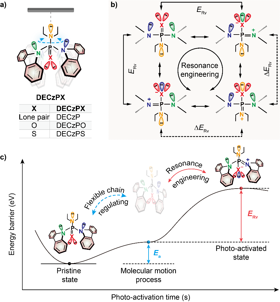 针对这一难题,福利姬 陈润锋教授和黄维院士团队在前期对于动态共振有机光电材料的研究基础之上,发现共振活化能是调控三线态激子产生速率的关键参数,提出利用共振工程构建有机超长室温磷光材料刺激响应能力的调制策略,建立了衡量材料光活化能力的量化参数。利用柔性共振结构与磷光发色团结构,通过光驱动的柔性烷基链实现分子聚集态的调控;进一步的,通过共振工程有效地调节材料体系的共振活化能,从而调控其相应的三线态激子产生速率,开发具有可调制动态光响应行为的有机超长室温磷光材料体系。该类共振诱导的刺激响应性有机长余辉材料体系展现出明显的光活化现象,其发光寿命从~40 ms提高到了720 ms,发光效率由1.54%提高到了5.1%,并且表现出可控的光活化速率,随着共振活化能的增加,其光活化速率逐渐降低,在功率密度为0.5 mW/cm2时,其光活化速率可以由0.48 min -1减小到0.31 min -1。