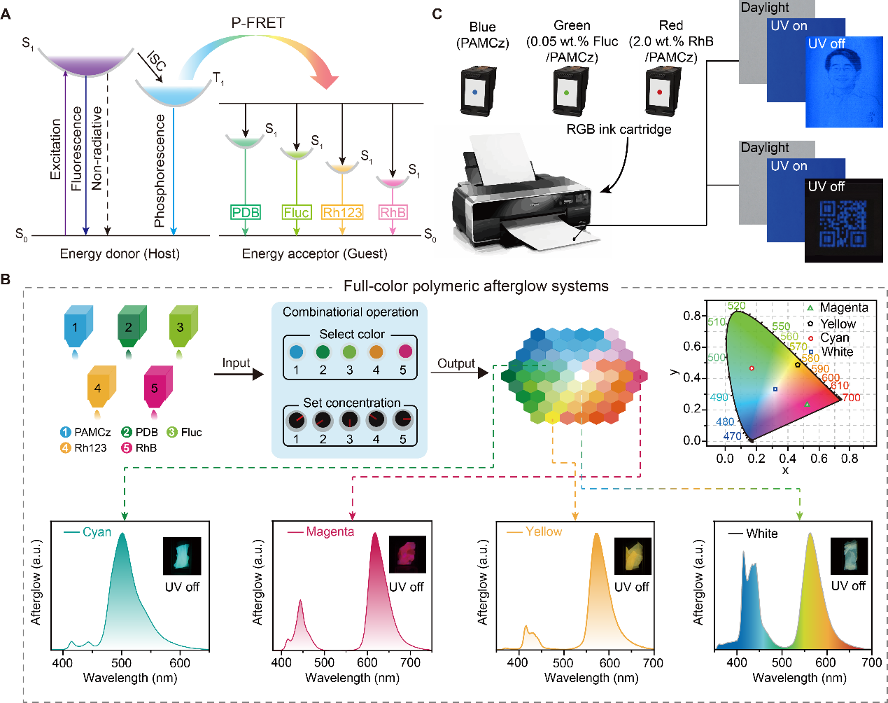 1:(A)三线态-单线态磷光敏化能量传递策略示意图;(B)全彩有机长余辉材料的构建和(C)安全打印应用