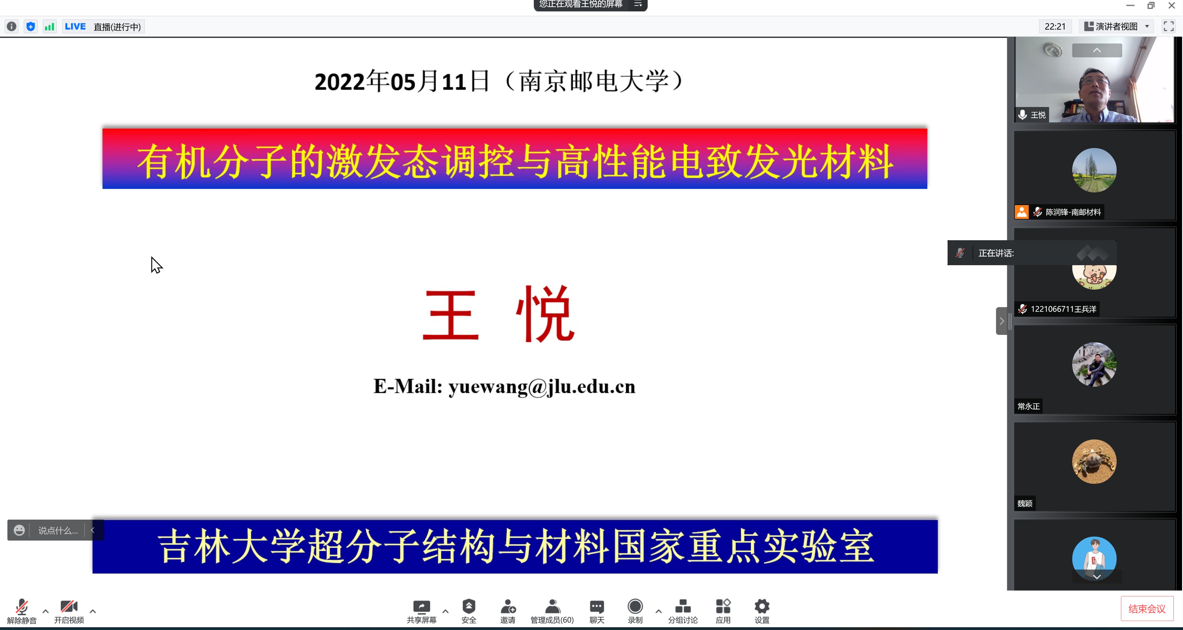 承国脉,薪火相传八十载;创未来,弘毅笃行谱新篇。值此南邮八十华诞校庆学术活动月之际,应福利姬 陈润锋教授邀请,吉林大学王悦教授于2022年5月11日下午2点在腾讯会议和腾讯直播上为师生作了以“有机分子的激发态调控与高性能电致发光材料”为主题的学术报告。陈润锋教授主持了报告,线上共有近100名师生参加。