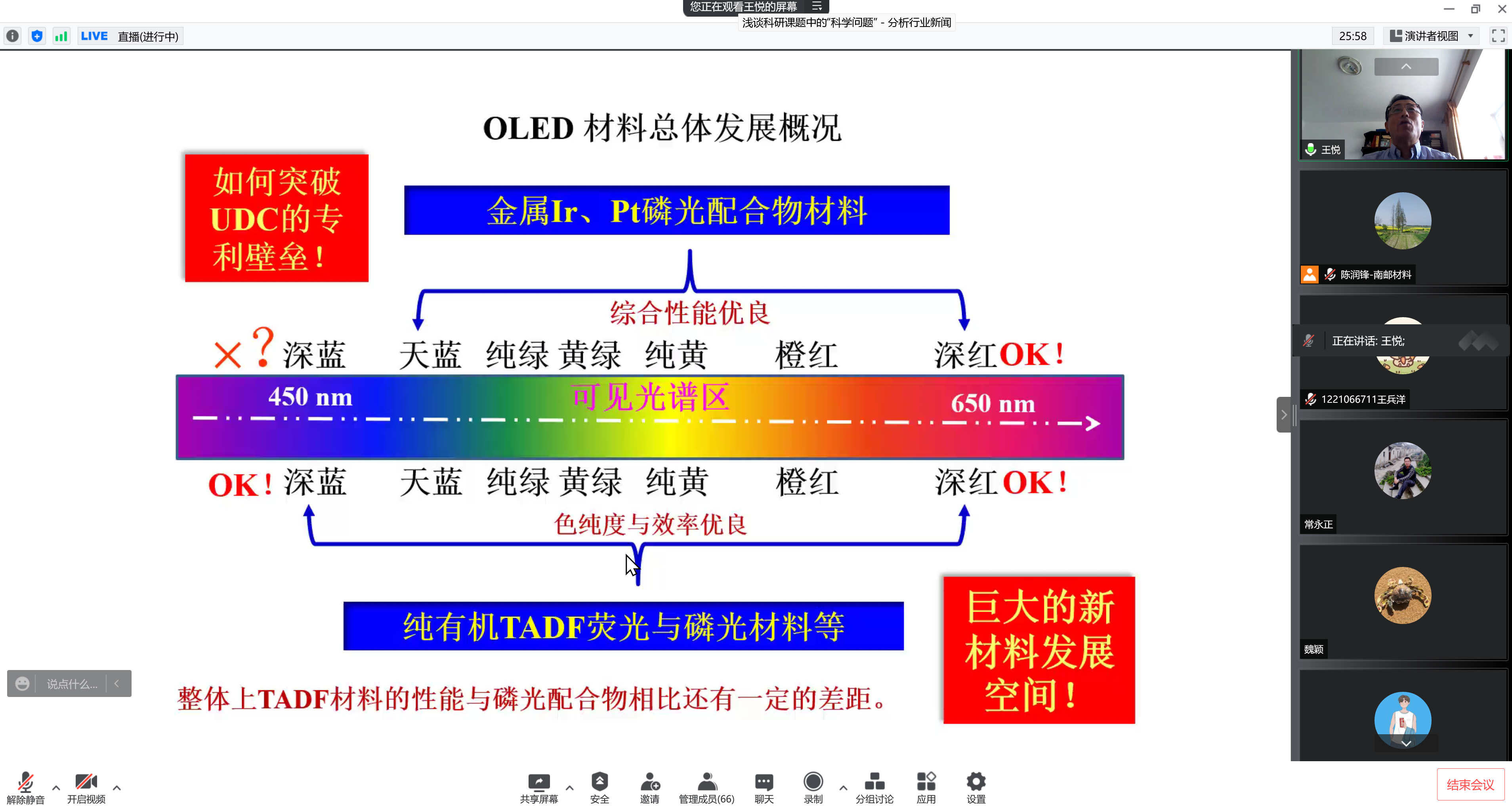 在报告中,王悦教授总结了OLED材料的发展概况,通过对比金属Ir、Pt磷光配合物材料与纯有机TADF荧光/磷光材料,指出了纯有机OLED材料在突破UDC专利壁垒中的巨大优势,然而发展高效率高色纯度长波长OLED材料及制备室温磷光高效率OLED器件仍然是该领域面临的重大挑战。针对以上问题,王悦教授提出了基于前线分子轨道工程(FMOE: Frontier Molecular Orbital Engineering)构建电荷转移激发态的材料设计方法,将多重共振(MR: Multiple Resonance)窄光谱激发态与经典的分子内电荷转移(D-A型ICT)激发态的优势完美结合在一起,在保证窄光谱发射前提下大幅度调控了发光材料的发射波长;同时,提出了复合薄膜体系中的能量转移机制,发展了基于主体材料诱导高效率有机磷光的方法,实现了高效率纯有机电致磷光发射。