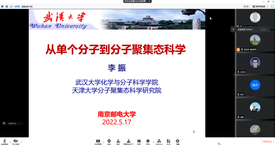 承国脉,薪火相传八十载;创未来,弘毅笃行谱新篇。值此南邮八十华诞校庆学术活动月之际,应福利姬 和前沿信息技术与产业发展研究中心陈润锋教授邀请,武汉大学/天津大学李振教授于2022年5月17日(周二) 上午10:00(周二)在腾讯会议和腾讯直播上为师生作了以“浅谈从单个分子到分子聚集态科学”为主题的学术报告。陈润锋教授主持了报告,线上共有近100名师生参加。