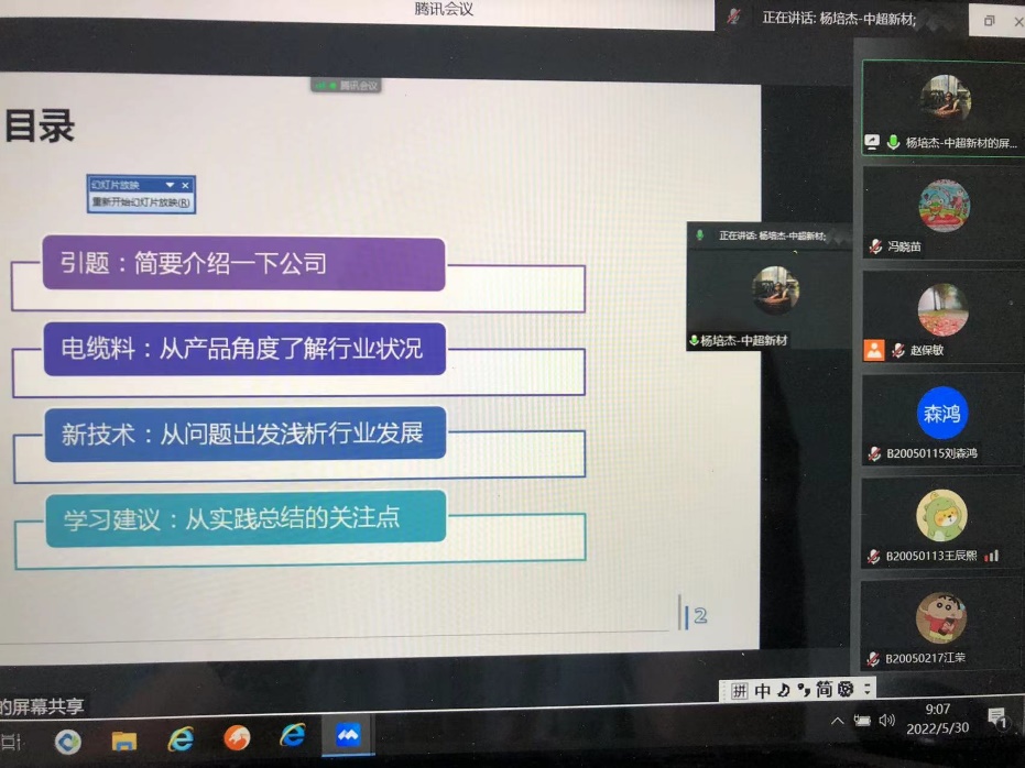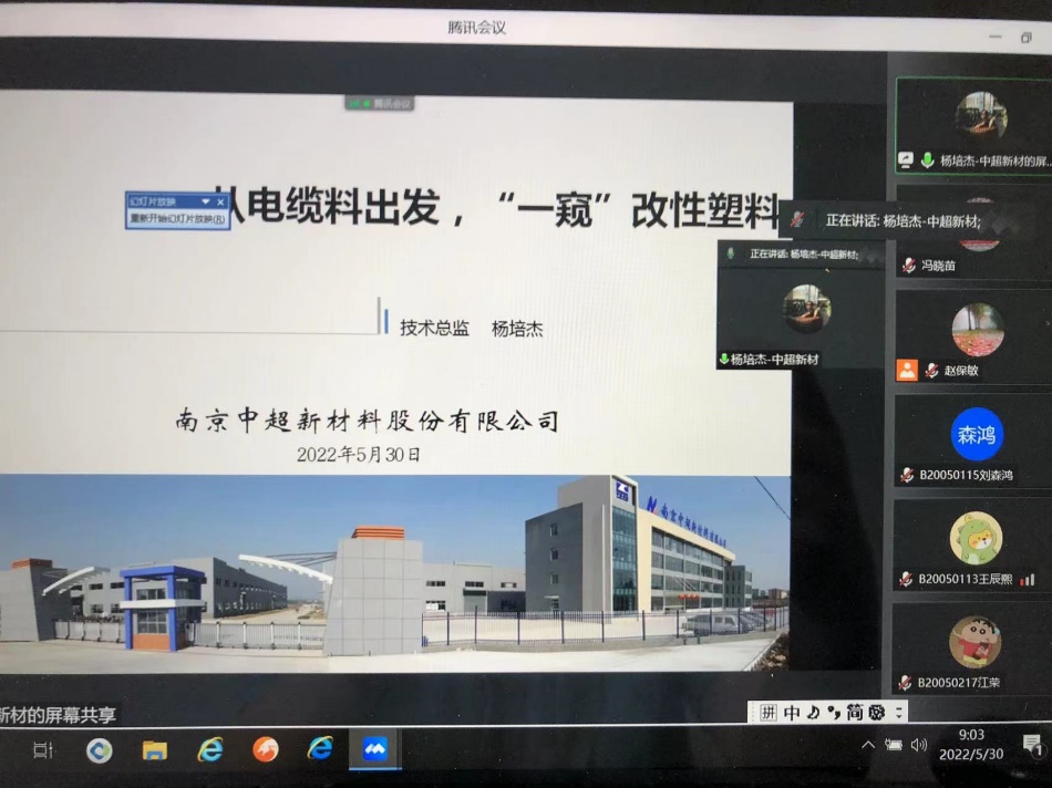 2022年5月30日上午,南京中超新材料有限公司杨培杰总经理为福利姬 高分子材料与工程专业学生作了一场生动且富有实用意义的报告。报告由福利姬 高分子材料与工程系系主任冯晓苗教授主持,系副主任赵保敏和B200501、B200502两个班全体同学参加了本次线上报告。