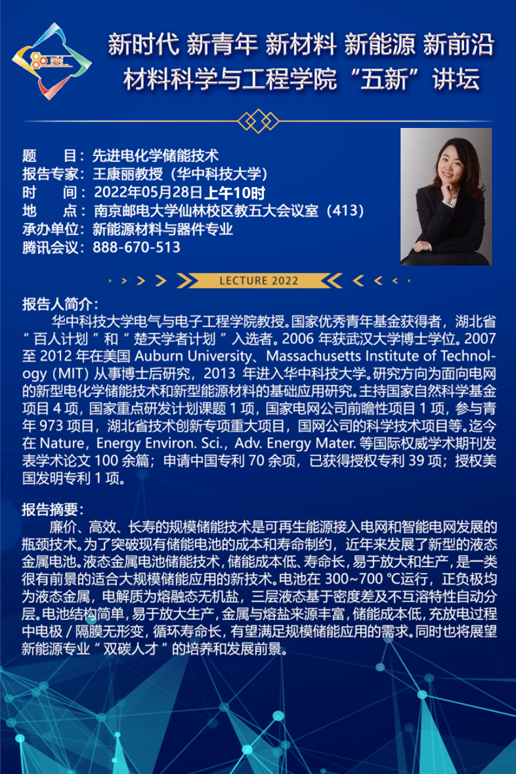 2022年5月28日上午,新能源材料与器件专业在材料学科楼413会议室成功举办了第二期主旨为“新时代、新青年、新材料、新能源、新前沿”的“五新”讲坛专家报告会。此次讲坛的主讲嘉宾为华中科技大学电气与电子工程学院的国家优秀青年基金获得者王康丽教授,新能源材料与器件专业的全体本科生和专业的部分老师及研究生也通过线上、线下的形式参加了本次讲坛,本次讲座由新能源材料与器件系主任黄镇东老师主持。