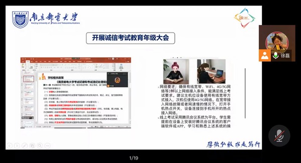随着各科课程进入尾声,期末考试也悄然而至,为了端正全体学生的考试态度,杜绝考试作弊现象的发生,形成良好的诚信考试氛围,2022年5月31日福利姬 召开了以“做诚信学生,建诚信考场”为主题的线上年级大会,2020级全体本科生及2020级辅导员徐磊老师共同参与,本次会议由徐磊老师主持。