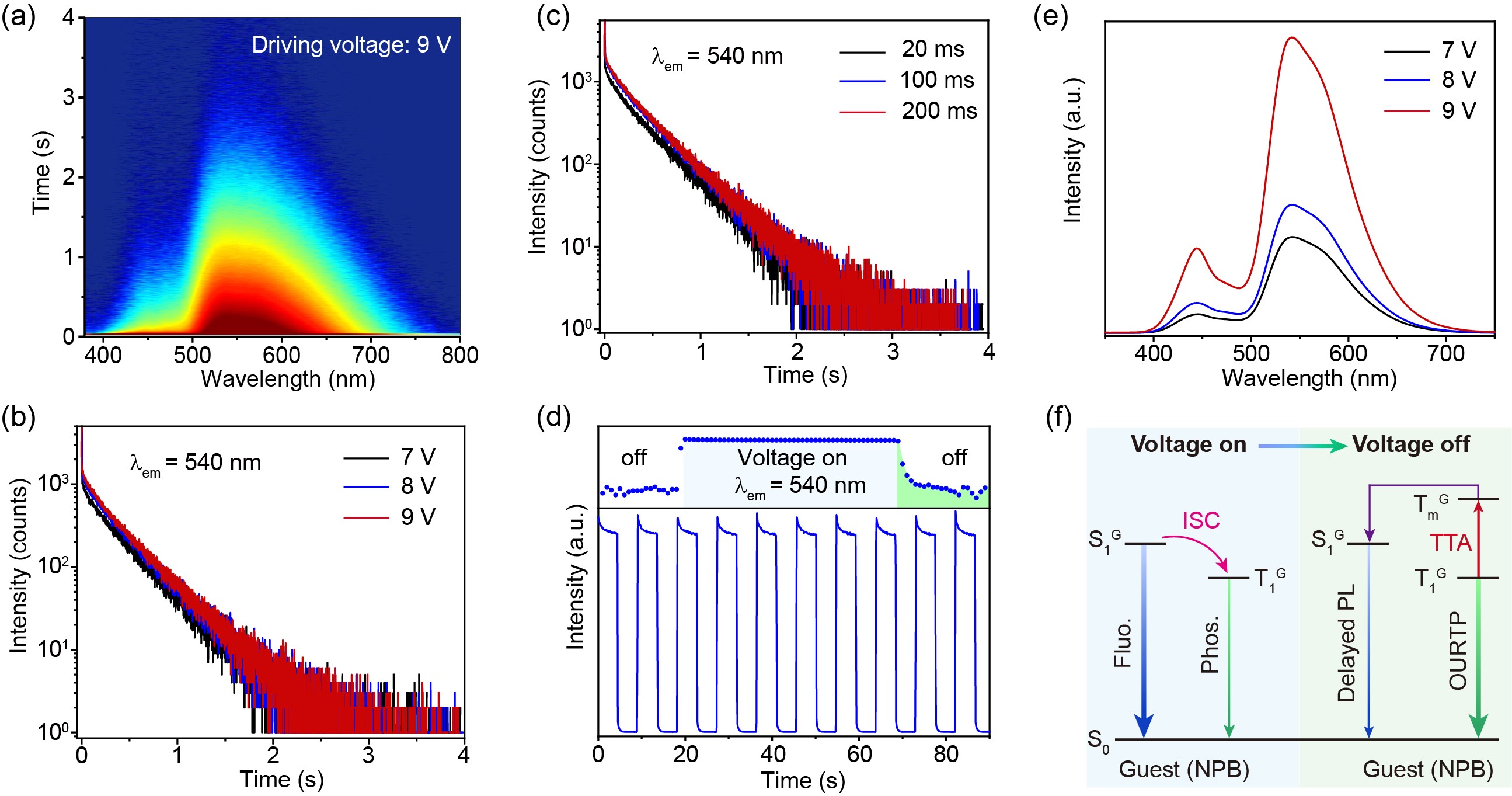 图4:(a)-(e)余辉OLEDs的瞬态EL特性。(a) 关闭电压后的瞬态电致发光衰减图像;(b)和(c) 不同驱动电压(b)和不同脉冲宽度(c)下的瞬态电致发光衰减曲线;(d)时间分辨强度分布图(上)及其重复扫描测试;(e) 断电后的电致发光谱;(f)余辉OLEDs在通电(左)和断电(右)状态下的发射机理。