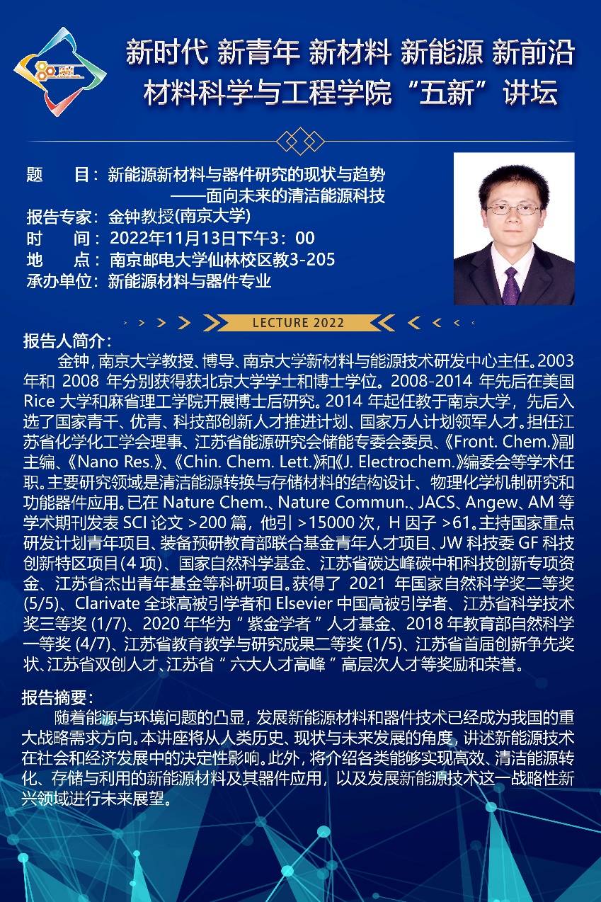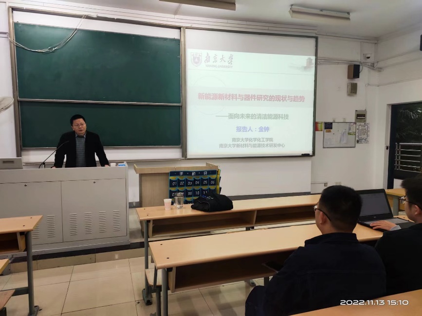 2022年11月13日下午,福利姬 在教3-205教室成功举办了第三期主旨为“新时代、新青年、新材料、新能源、新前沿”的“五新”讲坛。此次讲坛的主讲嘉宾为南京大学新材料与能源技术研究中心主任、国家领军人才、国家优秀青年基金获得者金钟教授。新能源材料与器件专业的全体学生和部分专业骨干老师及研究生参加了本次讲坛,本次讲坛由新能源材料与器件系主任黄镇东教授主持。