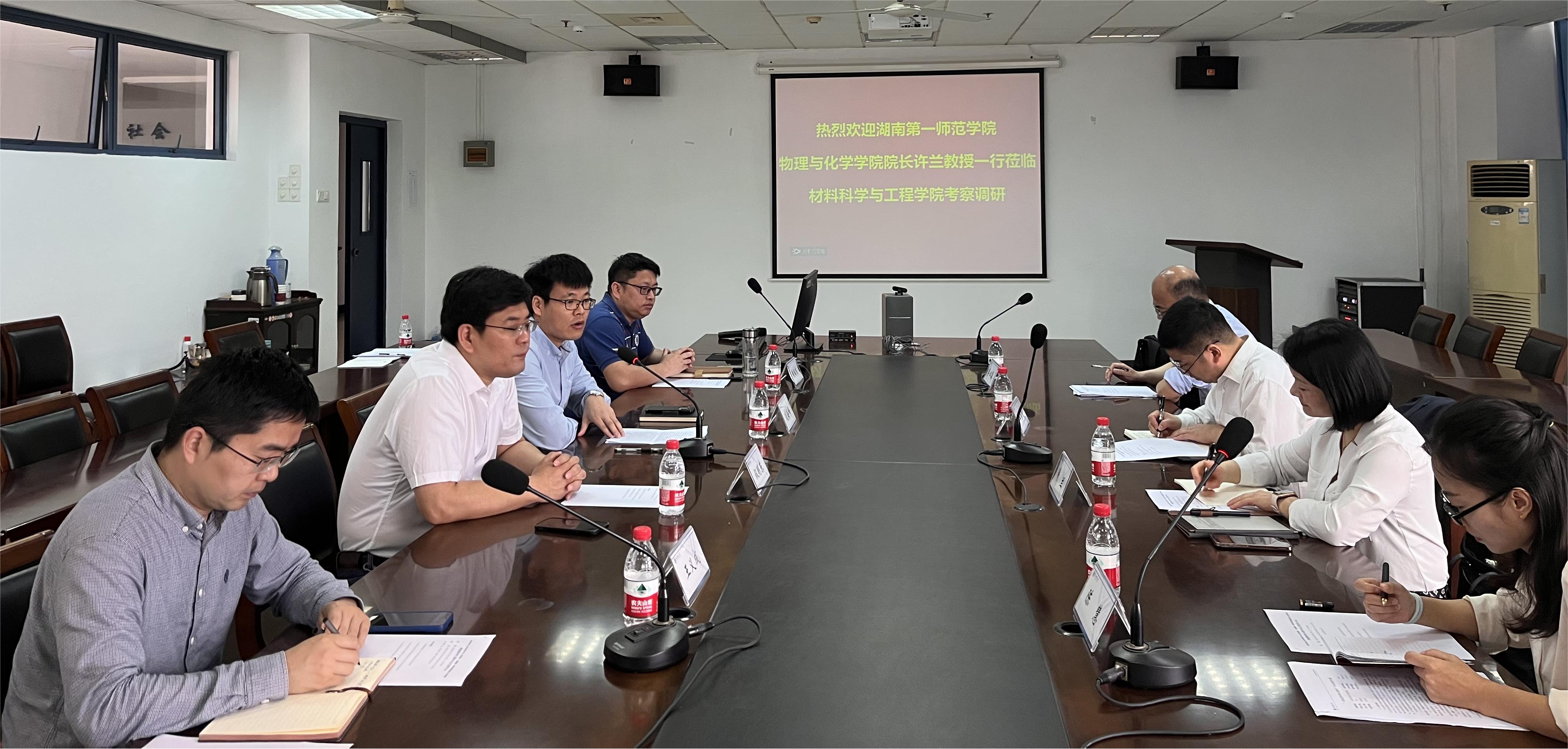 许兰副院长重点介绍了湖南第一师范学院的红色校史、在教育行业人才培养方面取得的成绩及物理与化学学院的发展历程及现状。双方围绕新能源器材料与器件专业的课程设计特色、学生培养及“挑战杯”、“互联网+”等竞赛组织展开交流。许兰副院长希望通过本次交流,双方可以架起专业建设、研究生招生及人才引进的桥梁。会后,湖南第一师调研组成员参观了新能源材料与器件本科教学实验室。