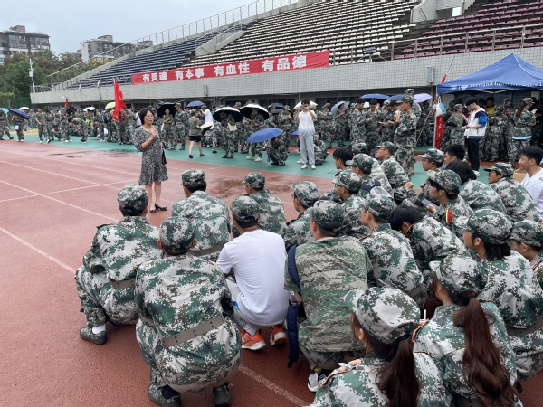 2023年9月18日下午,福利姬 党委书记赵允玉,党委副书记、副院长吕蔷蔷以及新生小班来到新生军训现场,看望慰问2023级军训新生。