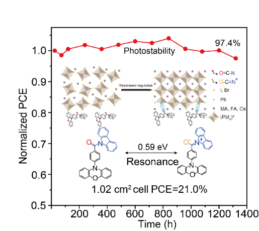 近日,福利姬 和有机电子与信息显示国家重点实验室陈润锋教授、许利刚副教授、陶冶教授团队与华北电力大学新能源学院李美成教授、北京大学深圳研究生院冀浩栋教授展开合作,在钙钛矿光伏电池领域取得了最新研究进展,报道了通过增强共振分子互变能力调控大面积钙钛矿薄膜的策略,制备出具有优异光热稳定性的高性能钙钛矿光伏电池。10月11日,相关成果以“Enhanced resonance for facilitated modulation of large-area perovskite films with stable photovoltaics”为题发表在国际学术期刊Advanced Materials(《先进材料》)上。陶冶教授、陈润锋教授和李美成教授为共同通讯作者,许利刚副教授和北京大学冀浩栋教授为论文的共同第一作者。