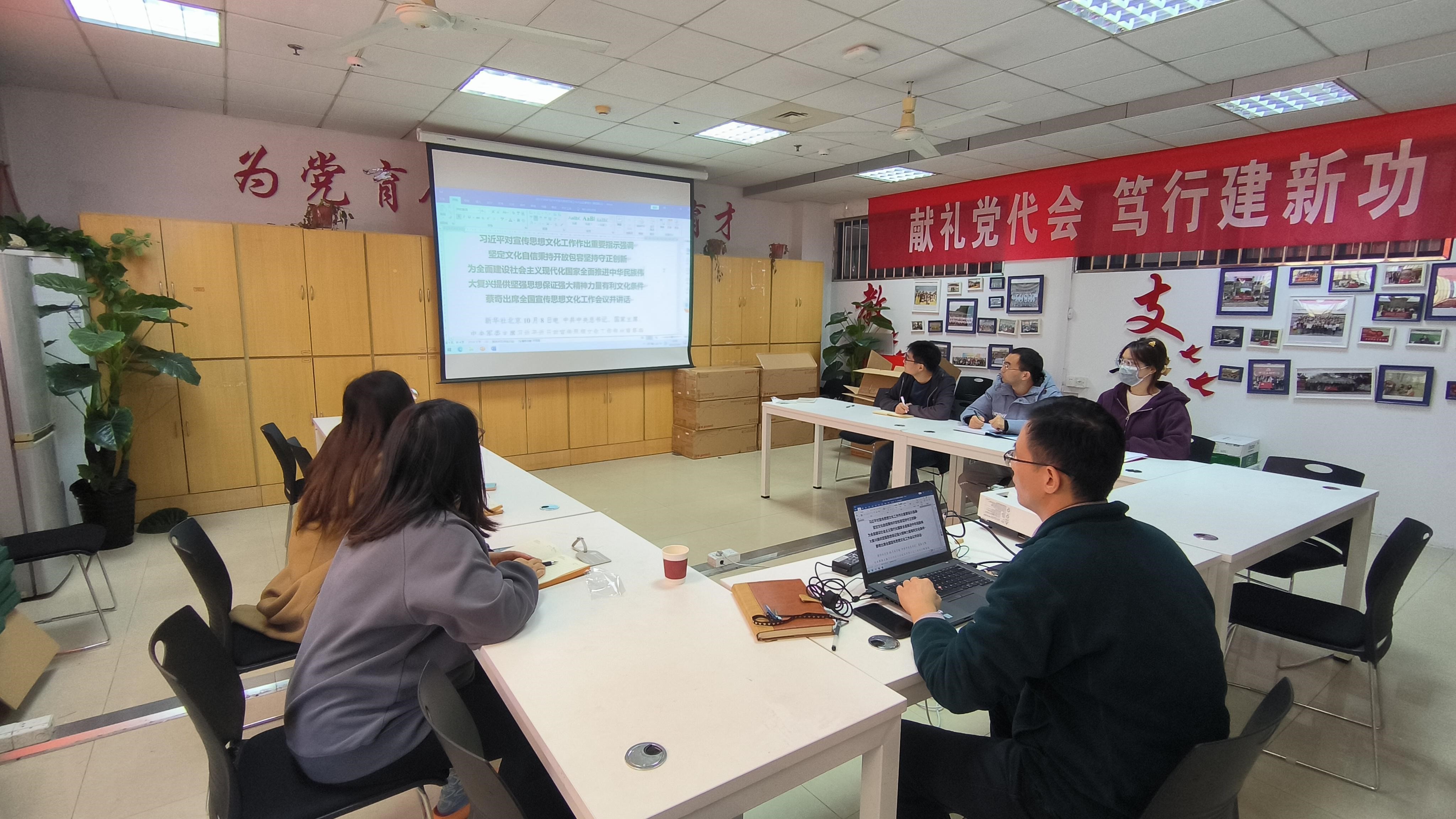 刘瑞卿书记带领大家学习了习近平总书记对宣传思想文化工作的重要指示和全国宣传思想文化工作会议精神,帮助支部党员全面了解思想文化工作的重大意义,宣传思想文化工作事关党的前途命运,事关国家长治久安,事关民族凝聚力和向心力,是一项极端重要的工作。习近平文化思想总结了新时代党领导文化建设的实践经验,为我们在新的历史起点上继续推动文化繁荣、建设社会主义文化强国、建设中华民族现代文明擘画了宏伟蓝图。作为基层科技工作者,一定要主动树立构建高质量科技创新工作的思想自觉和行动自觉,站在历史和时代的制高点上开展教育科技工作,着力加强科技自立自强建设,加快构建中国自主的知识体系,不断提升教育和科技实力。