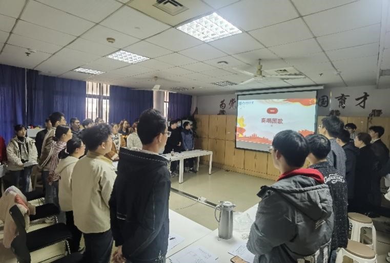 民主评议党员大会开始,全体起立,奏唱国歌。