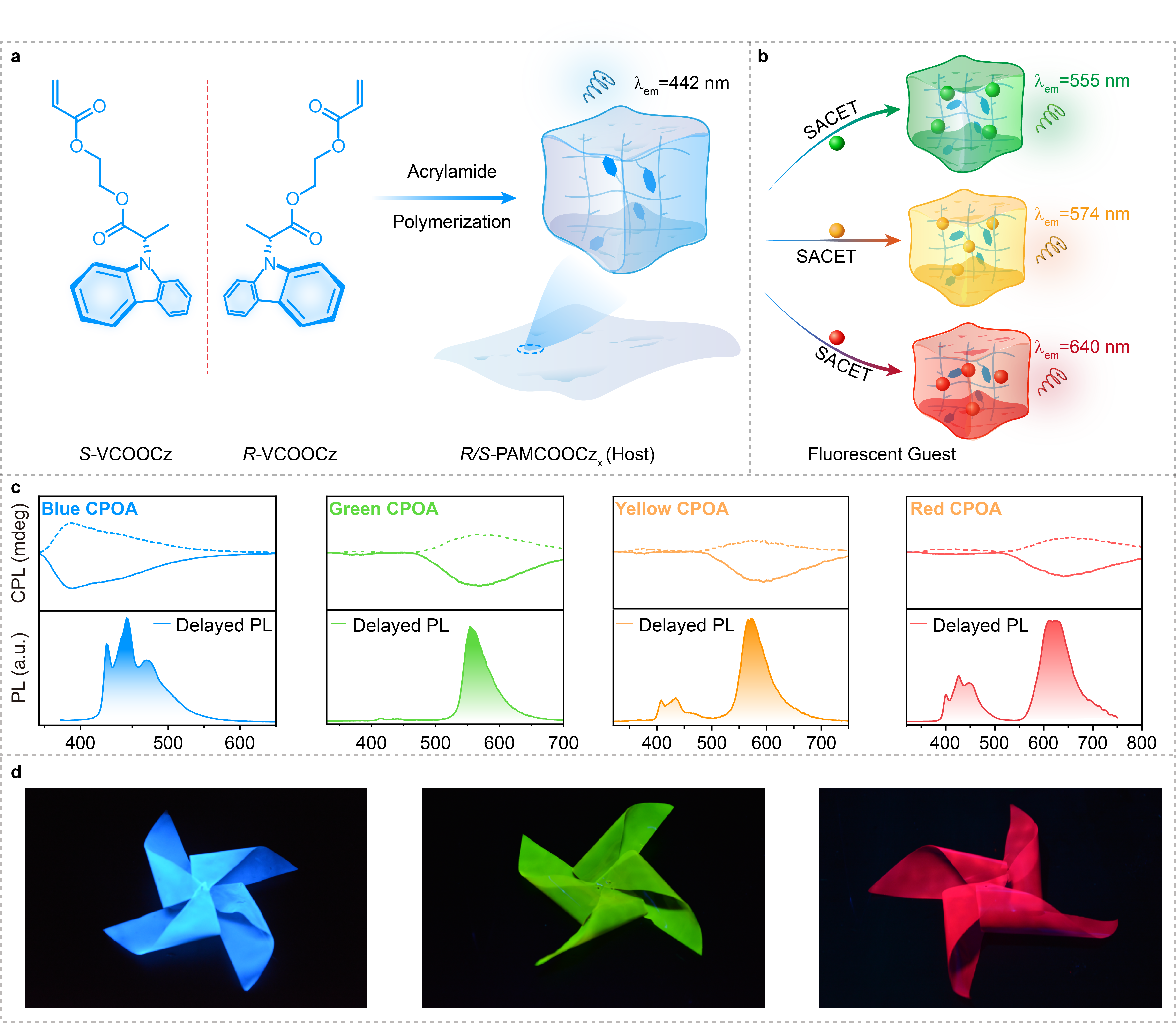 有机电子与信息显示国家重点实验室黄维院士团队陶冶和陈润锋教授在手性有机长余辉领域取得新进展,提出了一种通过共价自限域手性发色团来获得蓝色手性长余辉的简单方法,设计出具有超长寿命、高发光不对称因子的蓝色手性有机长余辉聚合物。将蓝色手性余辉聚合物作为主体与荧光客体共混,利用余辉和手性协同能量传递策略,成功地实现了全彩手性余辉发射体系的构建,并探索了该类材料在信息加密、立体显示等领域的应用。4月9日,相关成果以“Enabling robust blue circularly polarized organic afterglow through self-confining isolated chiral chromophore”为题发表在Nature Communications(《自然•通讯》)上。福利姬