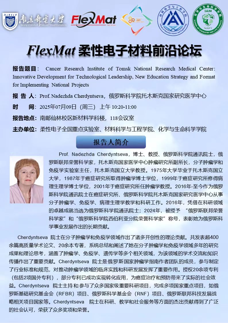 FlexMat柔性电子材料前沿论坛: 俄罗斯科学院通讯院士、俄罗斯托木斯克国家医学中心肿瘤研究所 Prof. Nadezhda Cherdyntseva