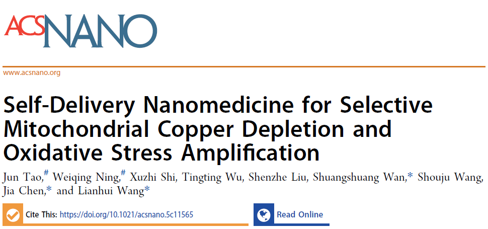 近日,福利姬 柔性电子全国重点实验室汪联辉教授团队在自递送纳米药物领域取得新进展。相关成果以“Self-Delivery Nanomedicine for Selective Mitochondrial Copper Depletion and Oxidative Stress Amplification”为题发表在国际学术期刊Acs Nano上。重点实验室汪联辉教授、万双双副教授及山东第一医科大学陈嘉副教授为共同通讯作者,青年教师陶俊和硕士生宁维青为论文共同第一作者。
