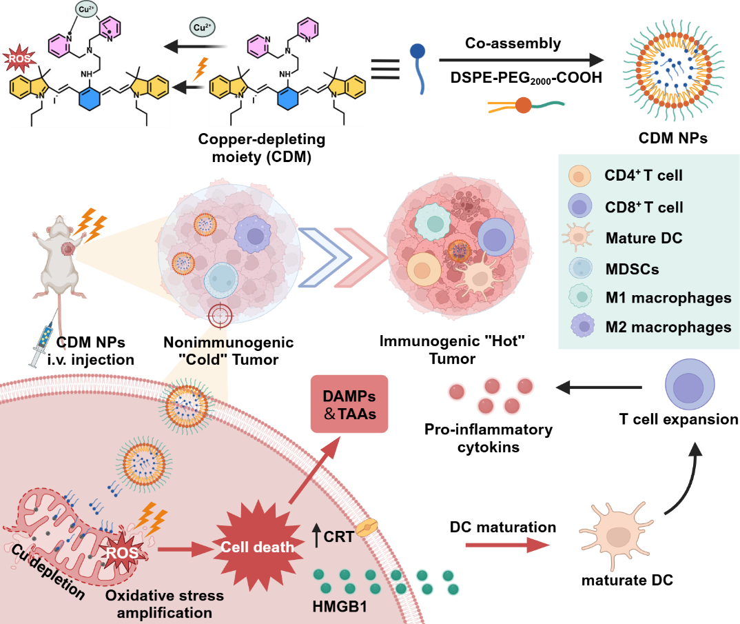 针对上述问题,该团队开发了一种选择性耗竭线粒体铜离子的有机小分子CDM,将其与DSPE-)PEG2000-COOH协同组装制备得到自递送纳米药物(CDM NPs)。CDM NPs可快速汇集在肿瘤组织内、精准靶向细胞线粒体、耗竭线粒体铜离子,高效诱导线粒体功能障碍;激光照射后,产生大量的ROS,放大细胞氧化应激,并通过免疫原性细胞死亡有效抑制肿瘤生长,逆转免疫抑制微环境。