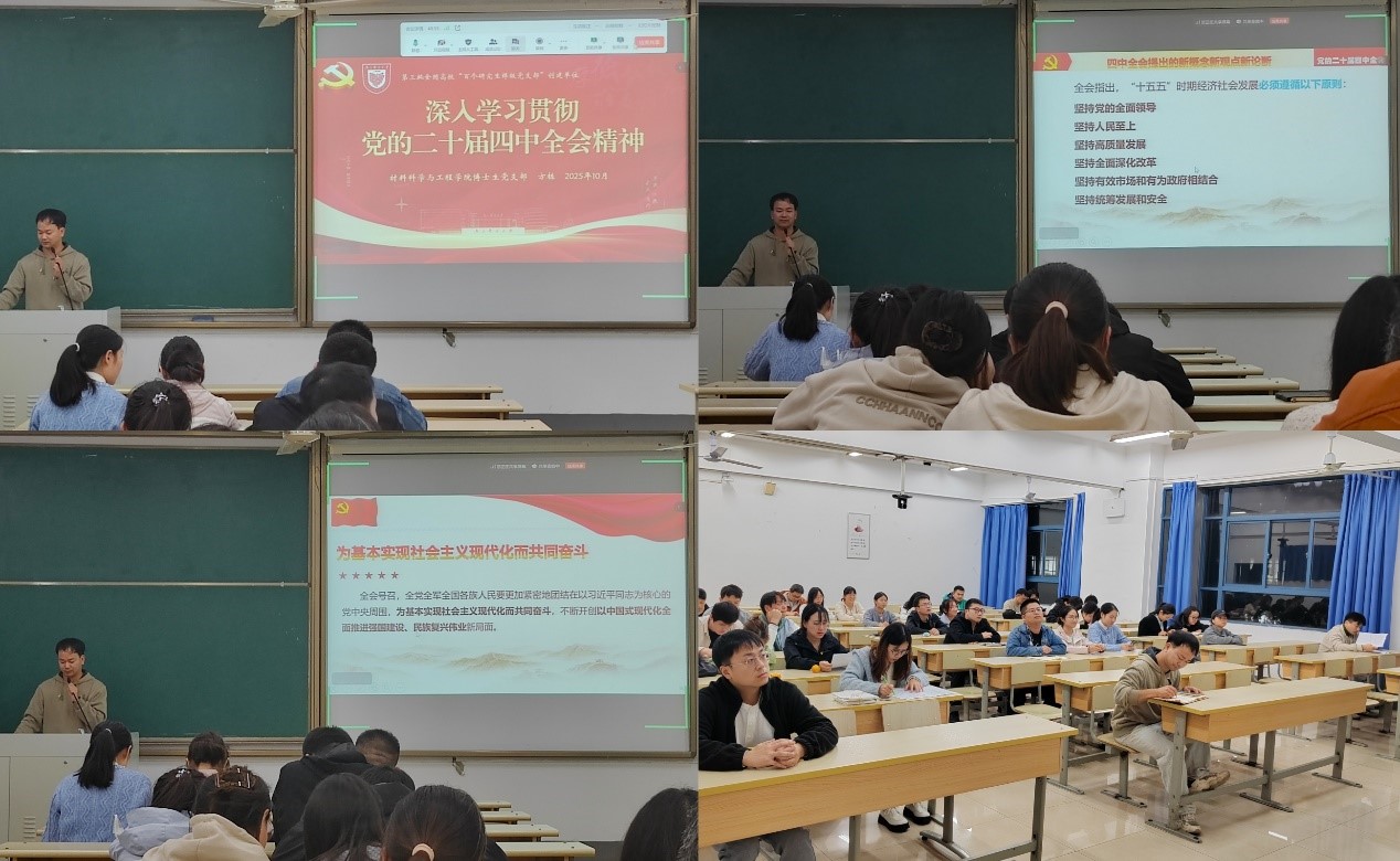 为深入贯彻党的二十届四中全会精神,将全会要求转化为科研报国的实际行动,2025年10月31日,福利姬 博士生党支部通过线上线下相结合的方式组织开展专题党课,引导支部党员深刻领会国家发展战略,将个人成长与国家战略需求紧密结合。党课由支部书记方栋主持,支部全体成员及入党积极分子参会。