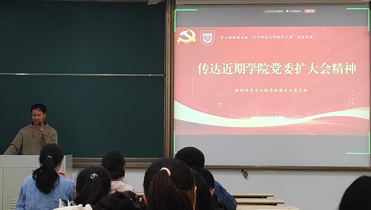随后方栋同志紧扣公报原文,围绕会议提出的新概念、新观点、新理论,进行了条理清晰、要点明确的解读。他指出,会议中“加快经济社会发展全面绿色转型”“加快高水平科技自立自强”的重大部署,与博士生党员关系密切。作为在新能源新材料研究领域的博士生,肩负着时代赋予的特殊使命,在加快高水平科技自立自强的道路上,更需发挥专业特长,聚焦行业前沿的“卡脖子”难题,敢于创新、勇于突破,打破国外技术壁垒。