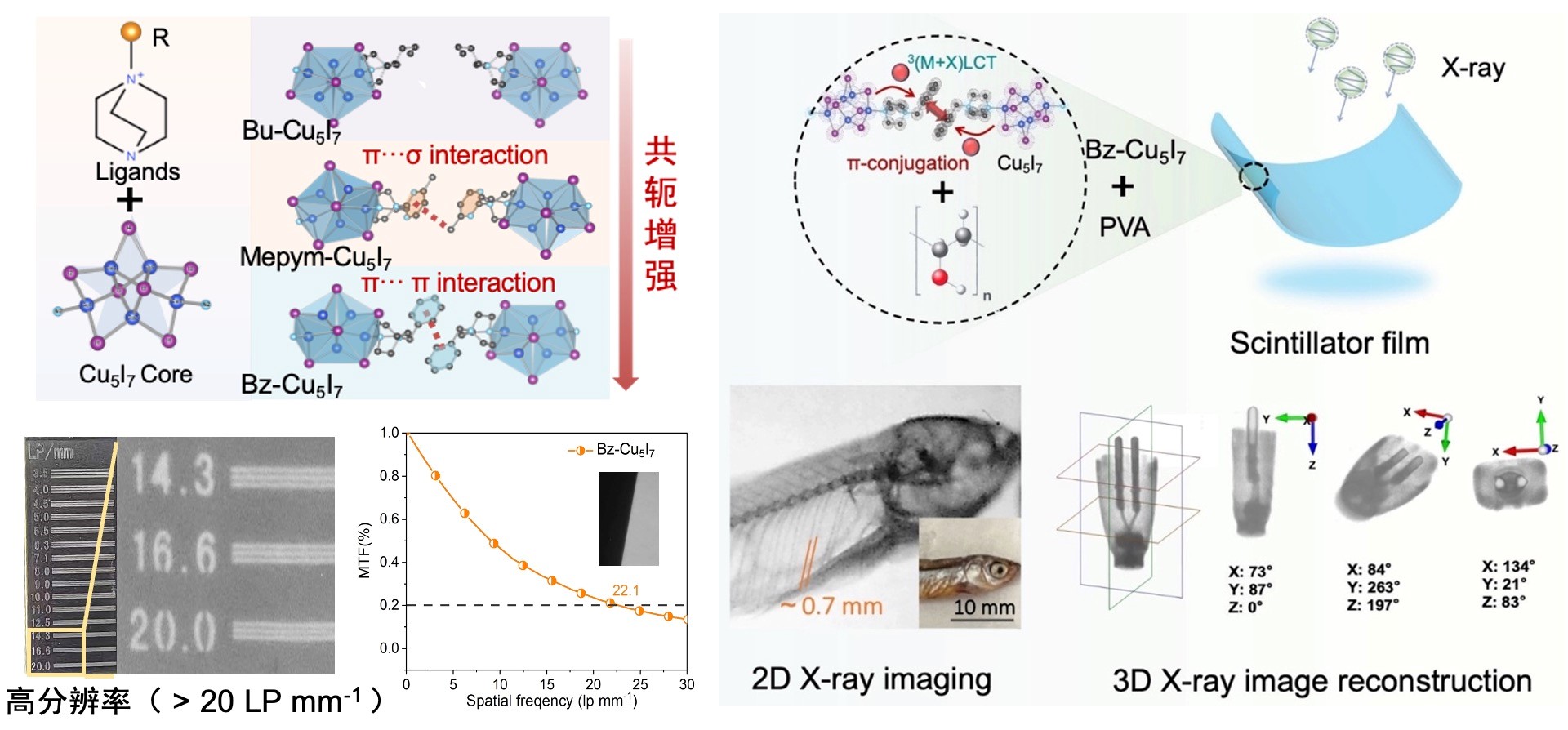 基于此,团队通过分子配体工程成功设计并合成了一种带有刚性有机阳离子的AIO型Cu(I)卤化物闪烁体(Bz-Cu5I7)。该材料通过分子间π–π作用有效稳定三重激发态,显著抑制了非辐射弛豫通道,从而实现了接近100%的光致发光量子产率(PLQY)。在X射线辐照下,该材料光产额是商用BGO闪烁体的4倍,且具备71.2 nGyair S-1的超低检测限,远优于传统材料的灵敏度。在器件构建方面,我们利用聚乙烯醇(PVA)作为柔性基底,成功制备出大面积、高亮度、低散射的柔性闪烁体薄膜,其空间分辨率超过了20 lp mm-1。该闪烁体薄膜在鱼骨架成像实验中清晰显示了细微结构度;在耳机插头和电子芯片等复杂器件的测试中,通过多角度辐射发光信号采集并结合三维重建算法,成功获得全景3D结构与断层切片,准确描绘其内部灰度分布与细节特征(图1)。